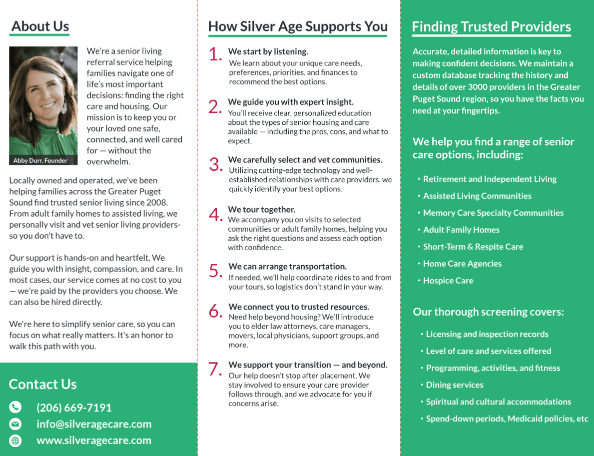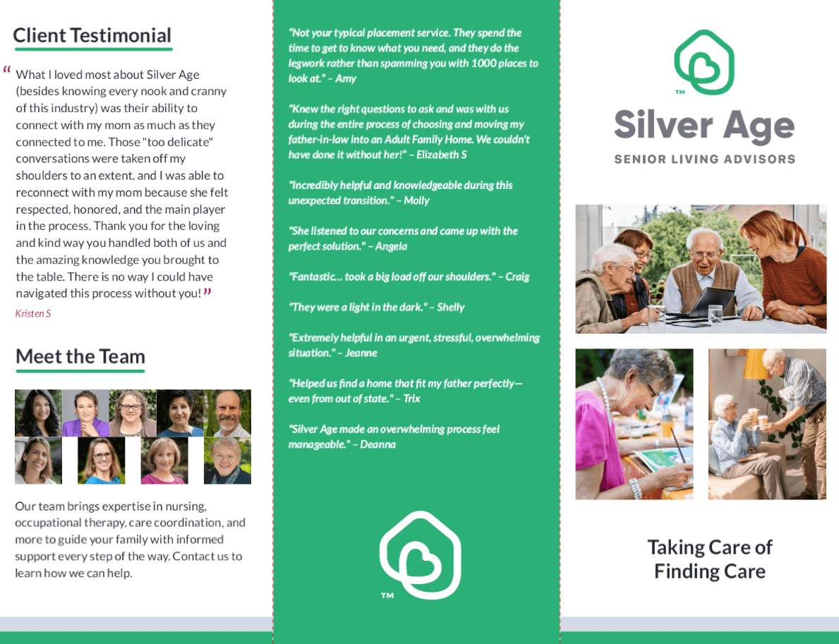 The team personally vets more than a thousand providers across King, Snohomish and Pierce counties, touring communities in person and maintaining close relationships with owners and care teams. Families often reach out during moments of dementia progression, falls, caregiver burnout or sudden medical changes, and Silver Age offers clear explanations of care levels, costs and safety considerations to help them move forward confidently.